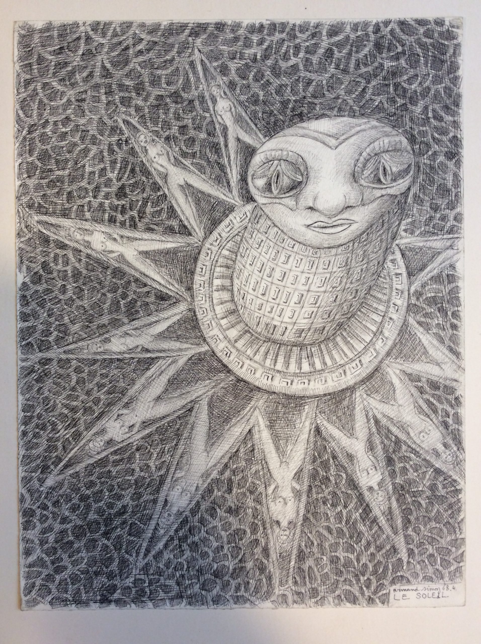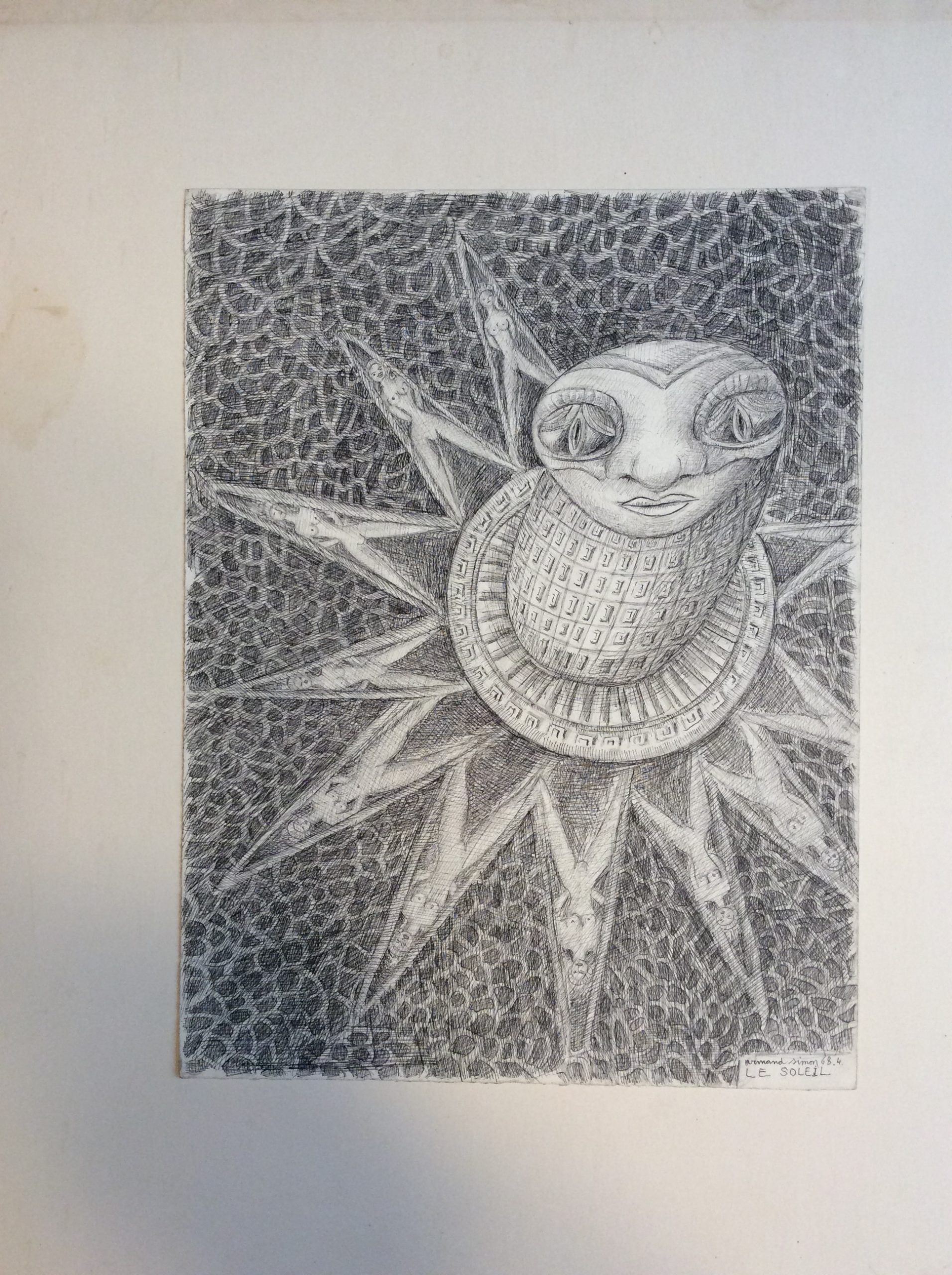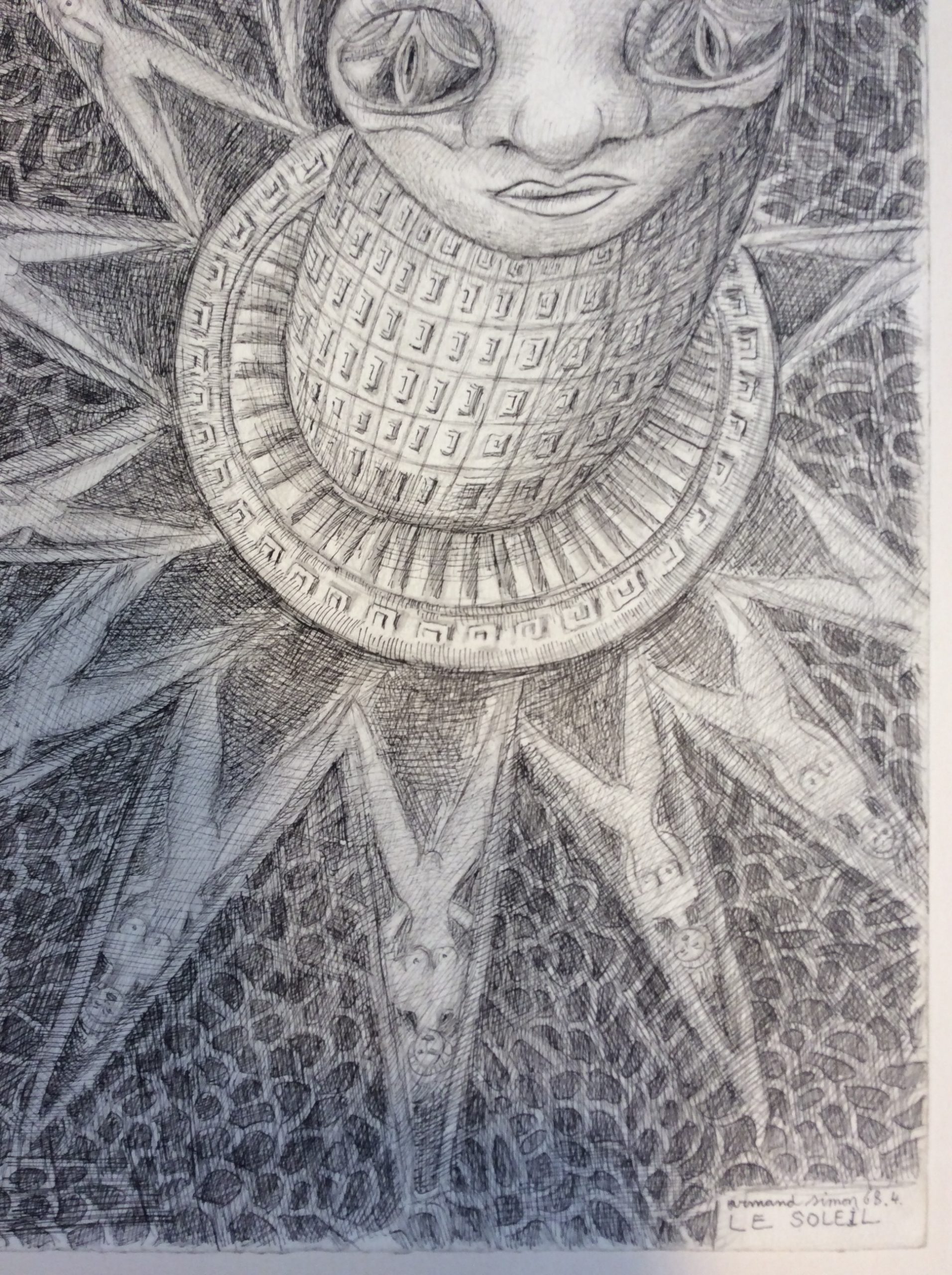 Dessin à l’encre de Chine d’Armand Simon – surréaliste , intitulé » Le Soleil ». Signé et daté 1968.