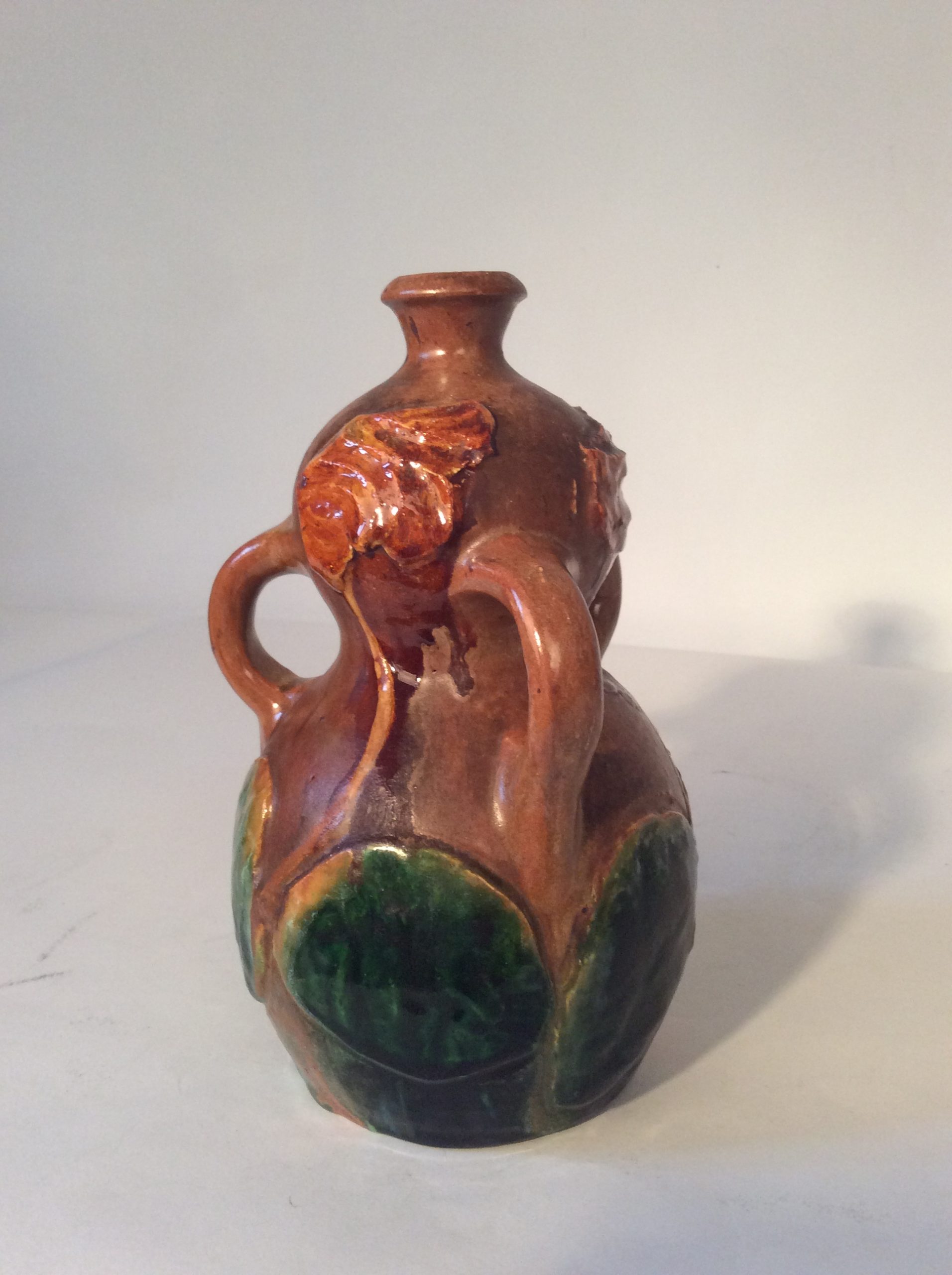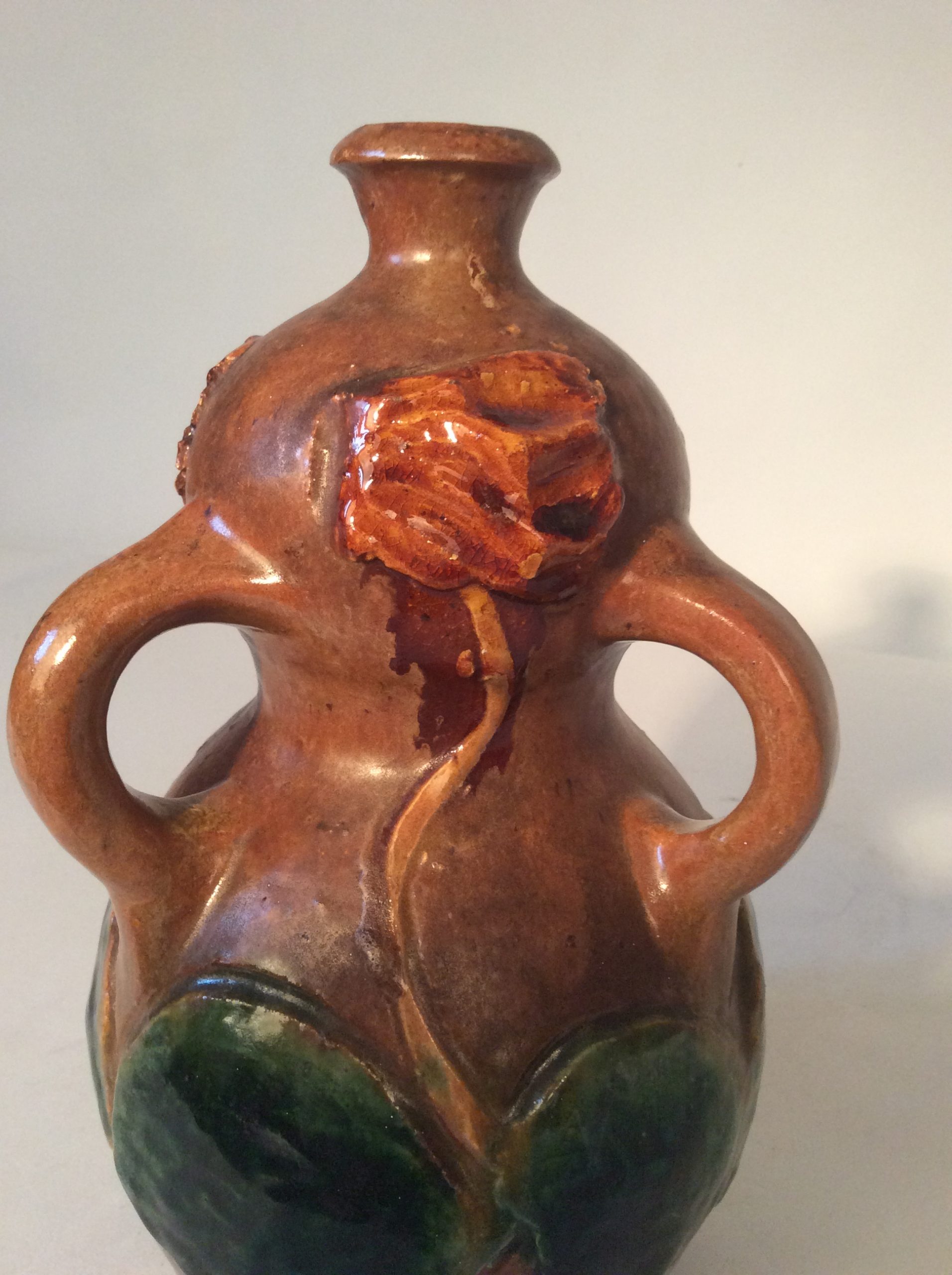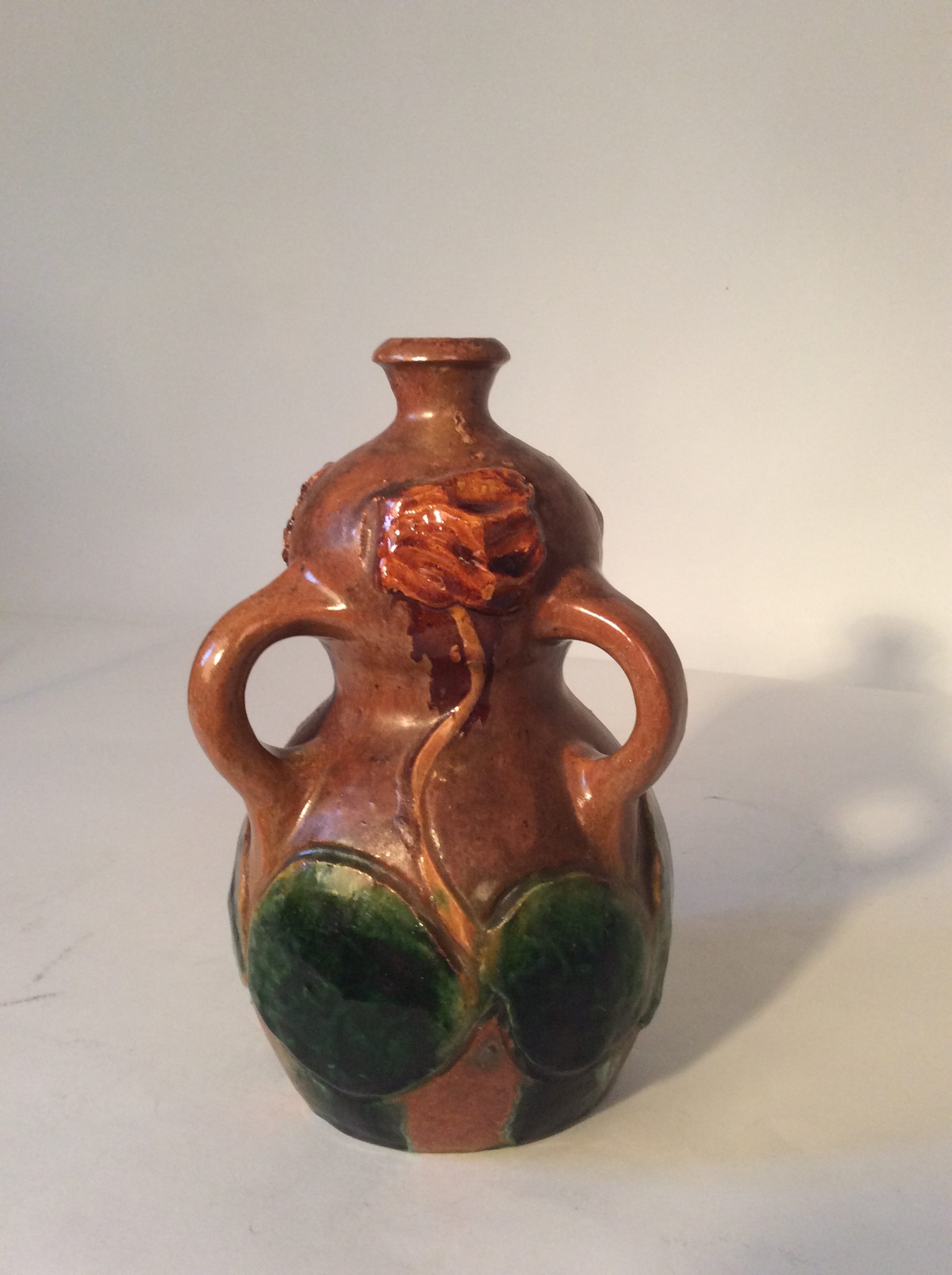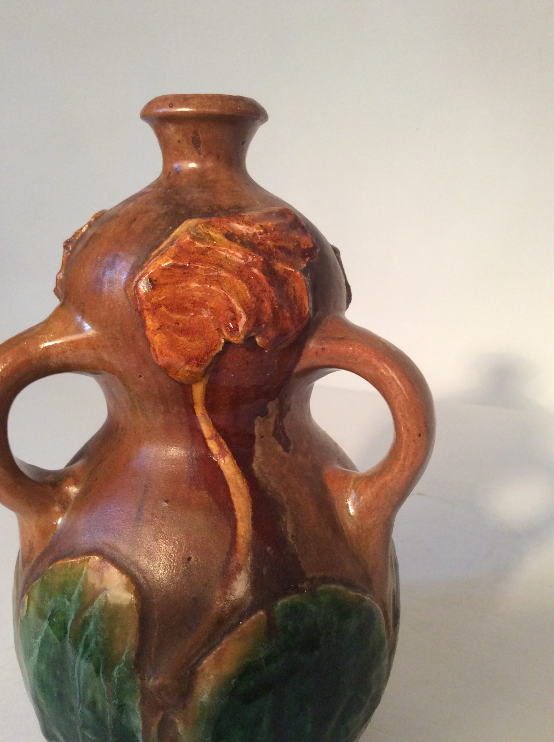 Vase soliflore Art Nouveau bilobé a’ trois anses dans les tons brun, beige et vert avec application de fleurs de coquelicots en relief . La pièce est signée sous la couverte