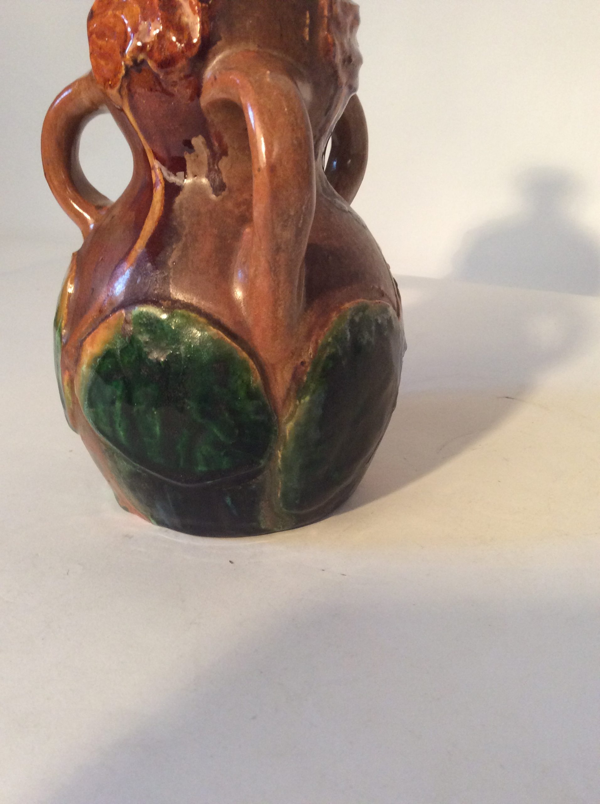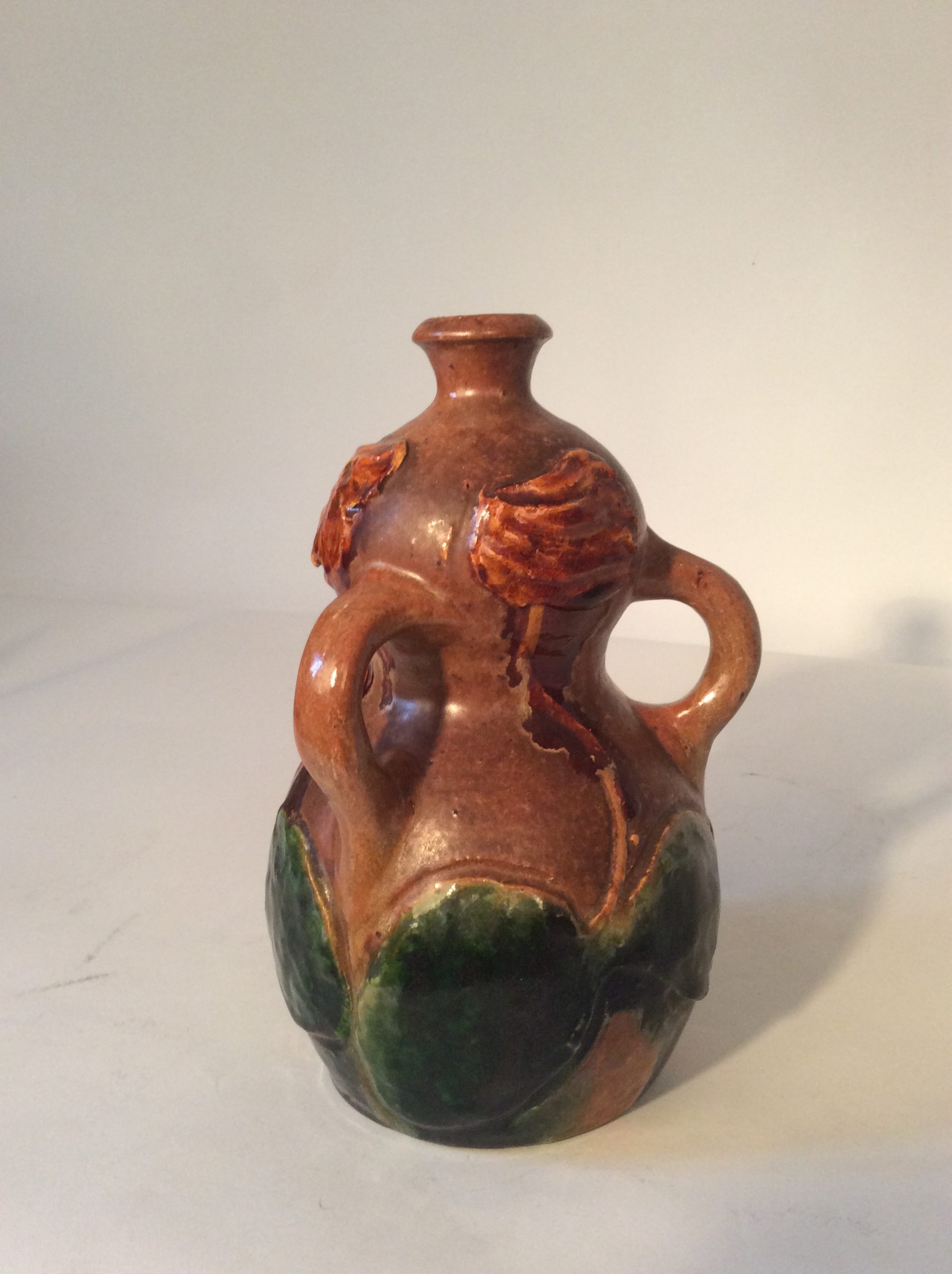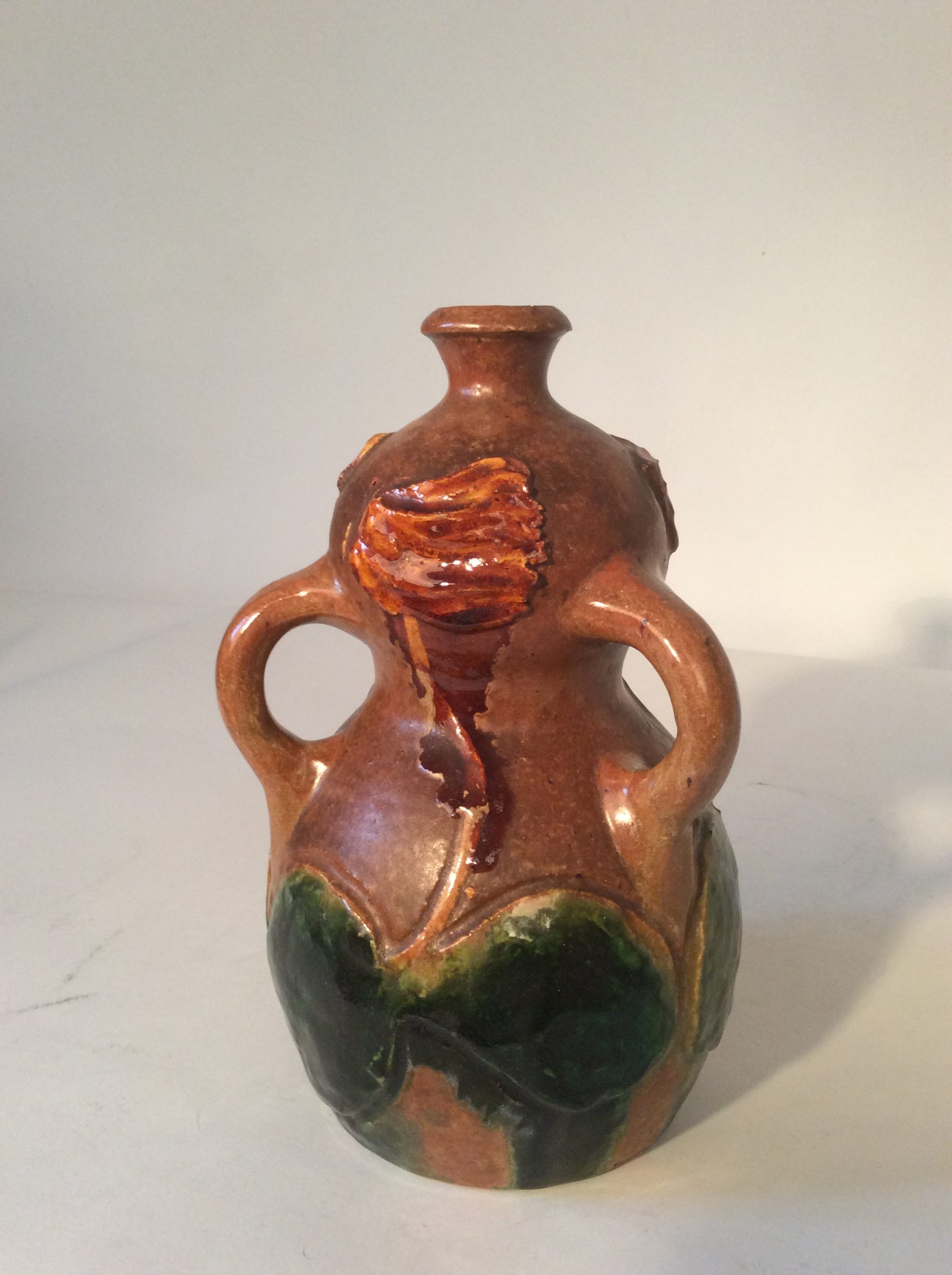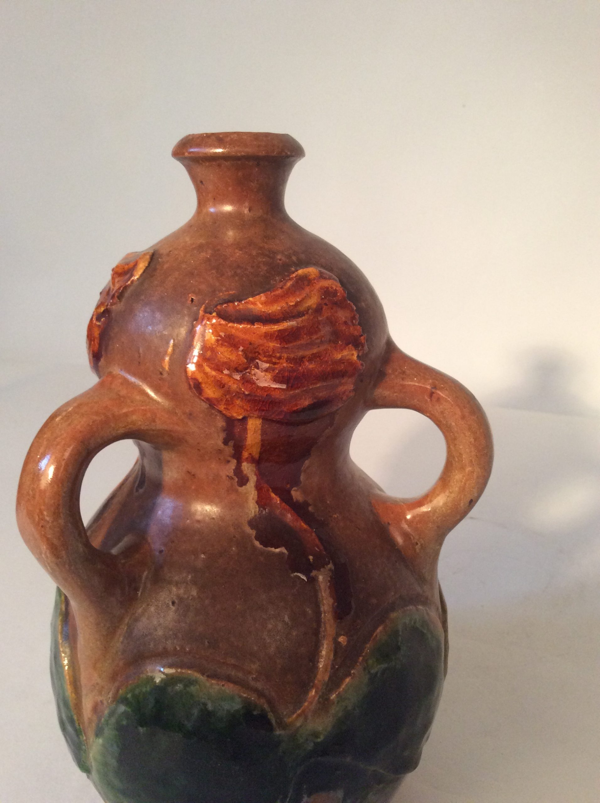 Vase soliflore Art Nouveau bilobé a’ trois anses dans les tons brun, beige et vert avec application de fleurs de coquelicots en relief . La pièce est signée sous la couverte