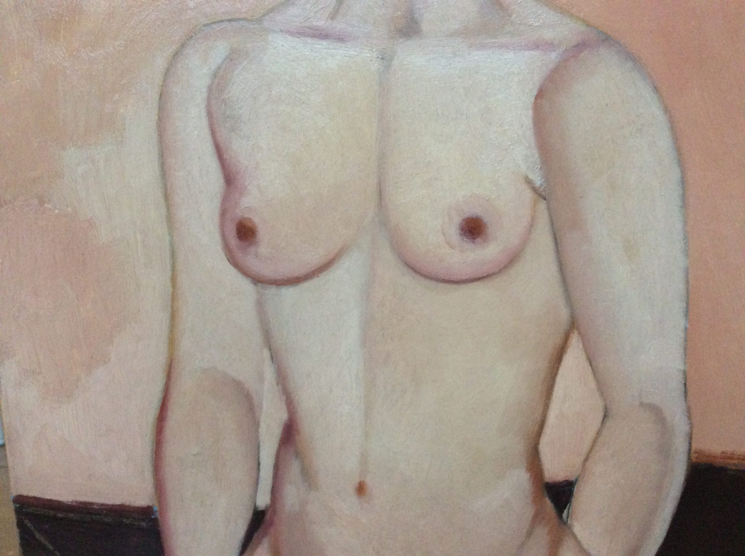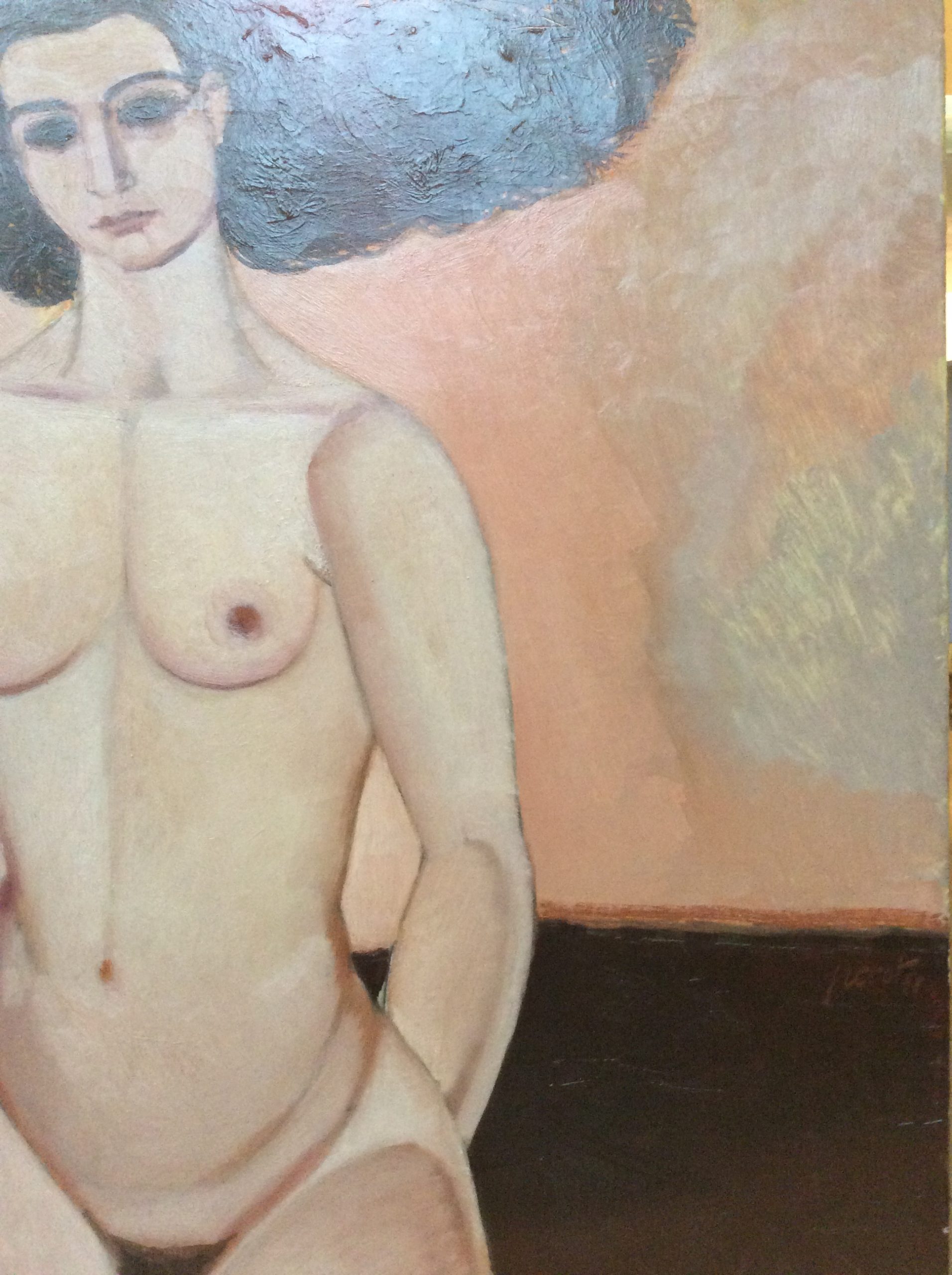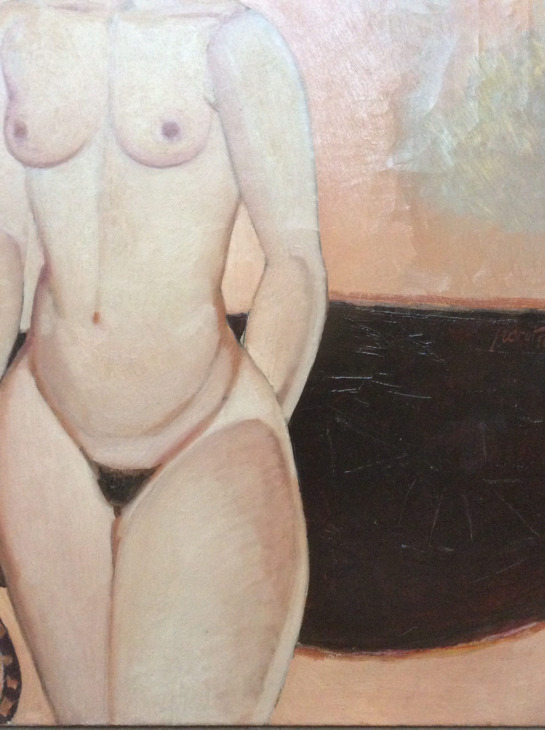 Huile sur toile de Luc Perot représentant une femme nue debout tenant en main un éventail.
