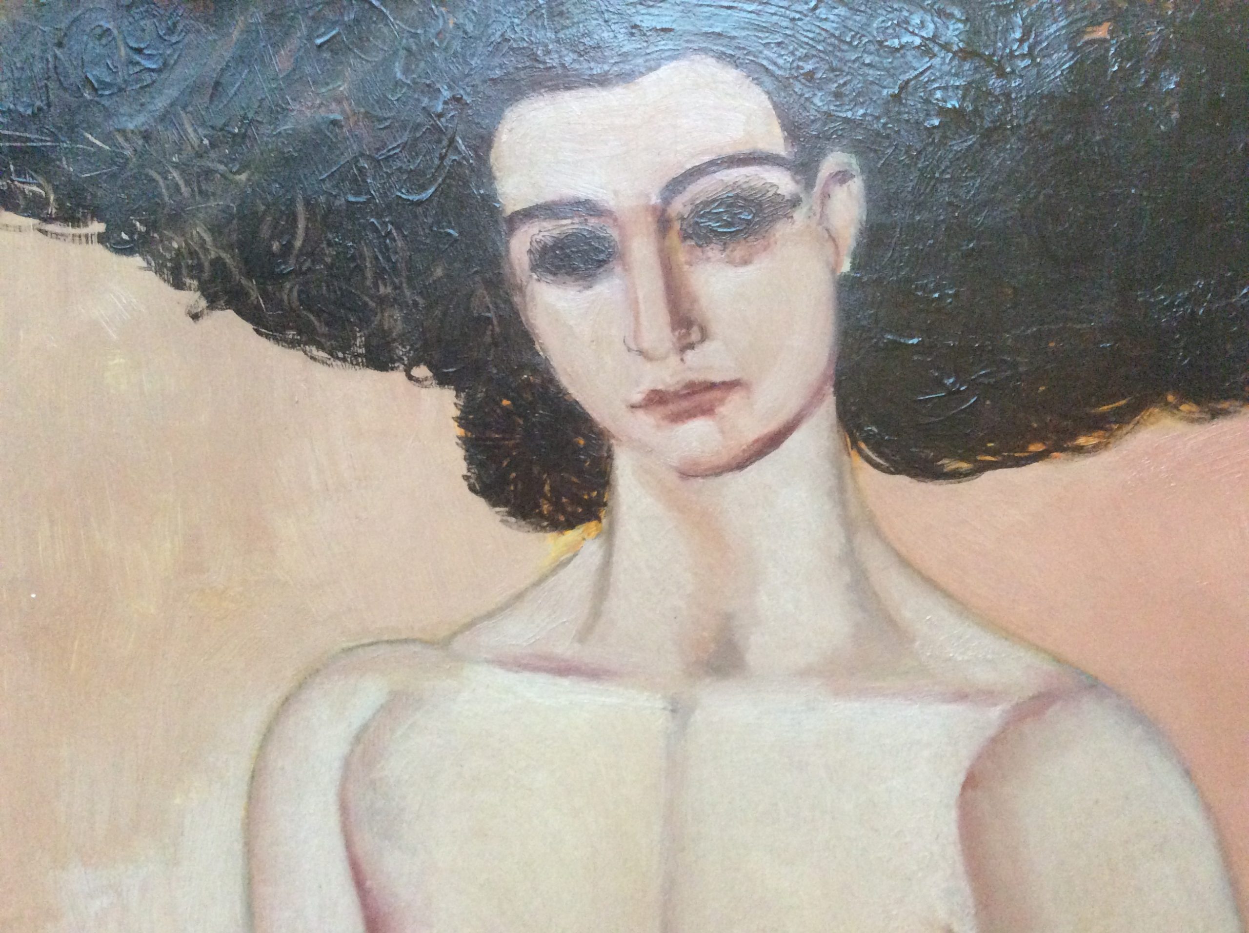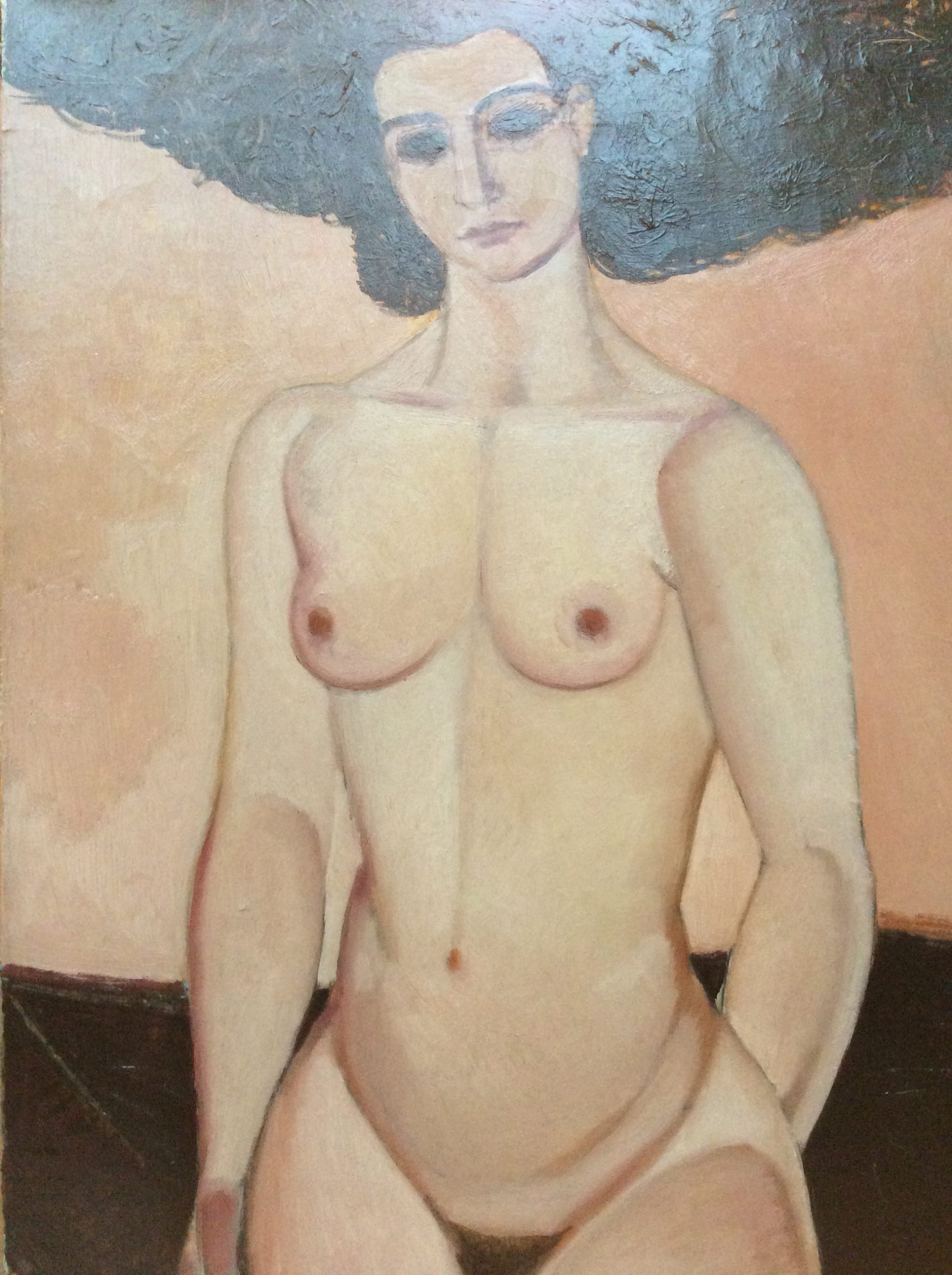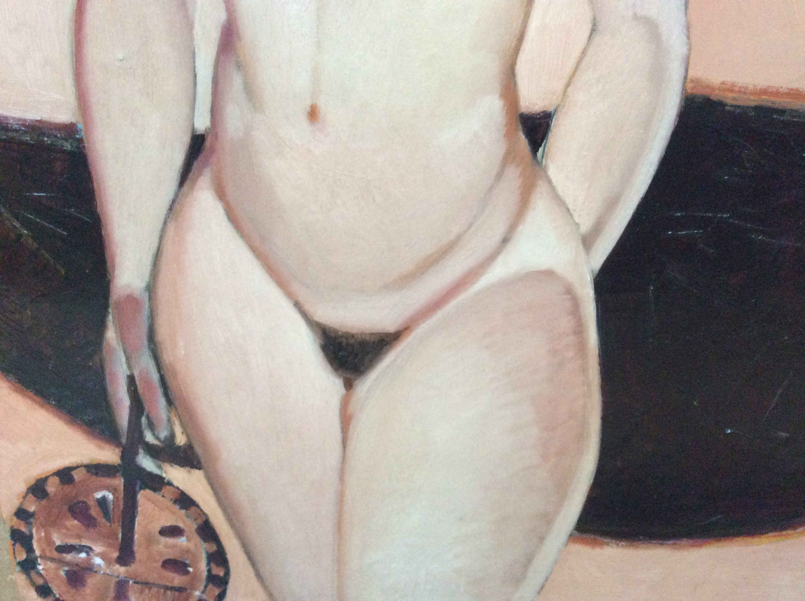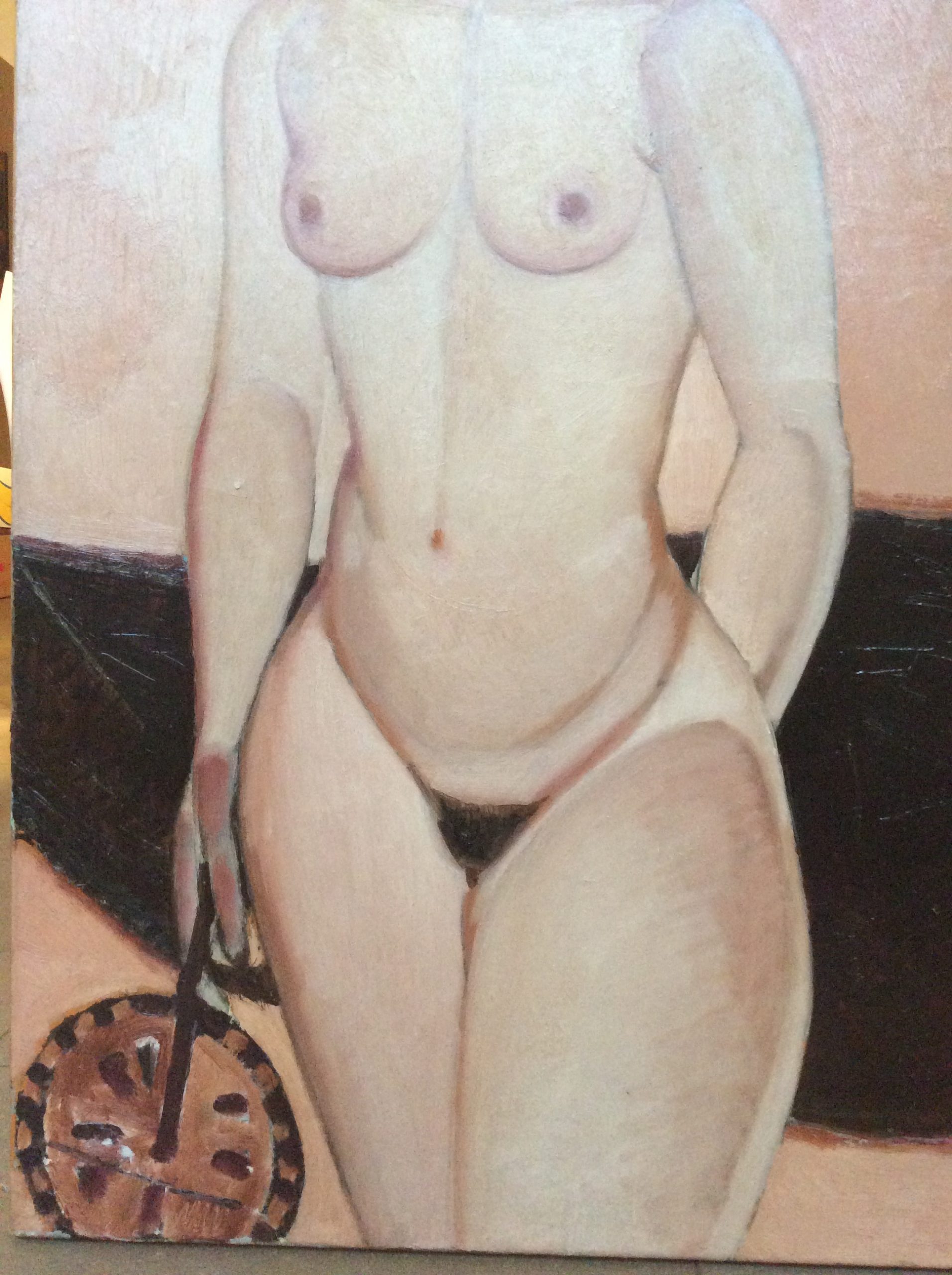 Huile sur toile de Luc Perot représentant une femme nue debout tenant en main un éventail.