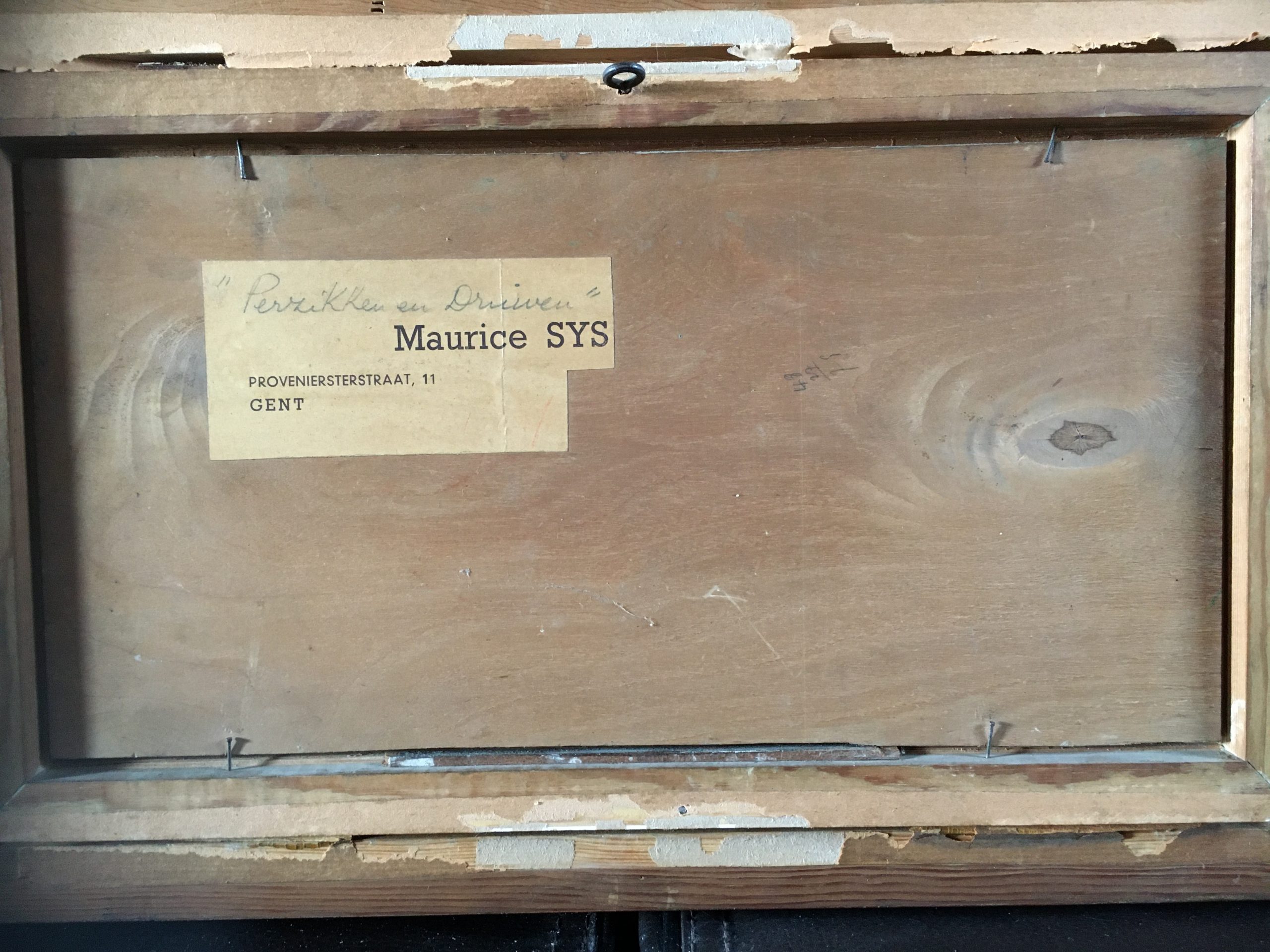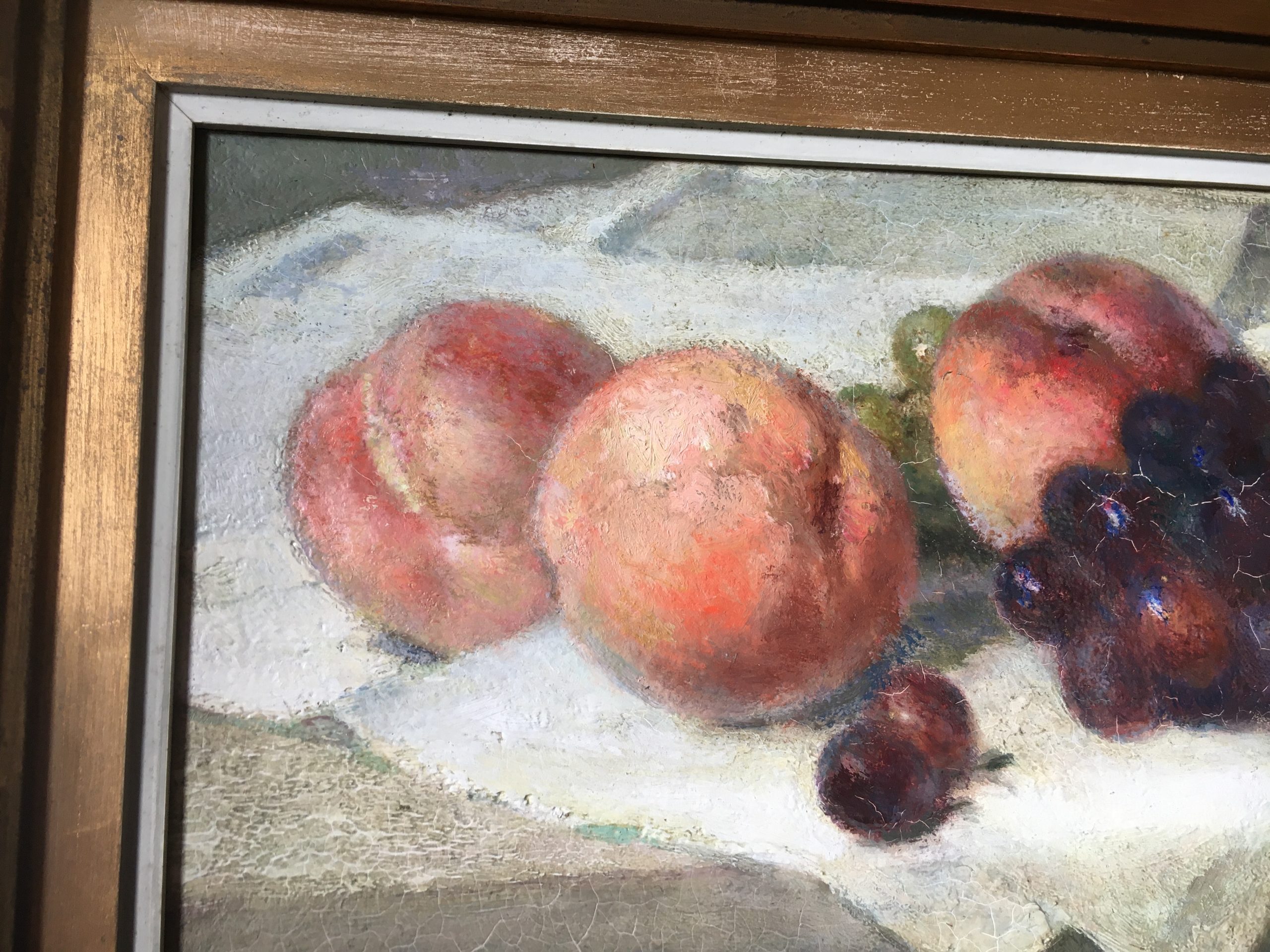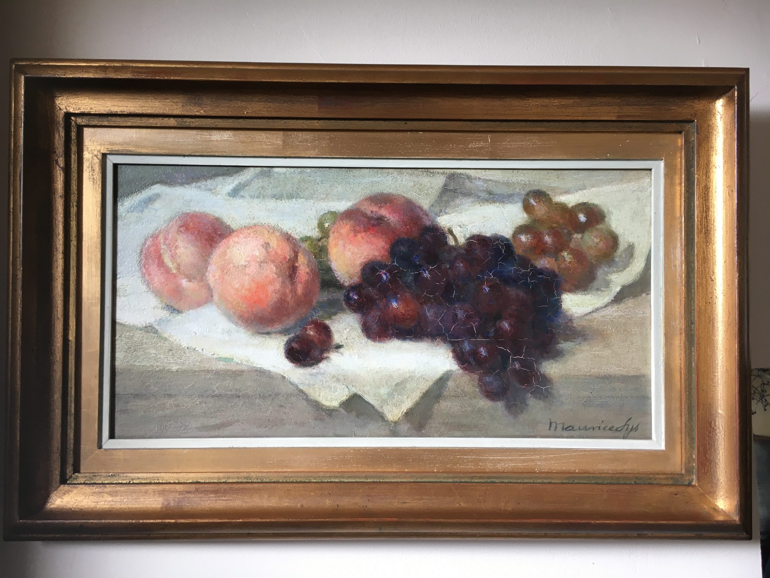 Maurice Sys – Nature morte aux raisins et aux pêches. Huile sur panneau./ Maurice Sijs – Stilleven met druiven en perziken. Olie op paneel.
