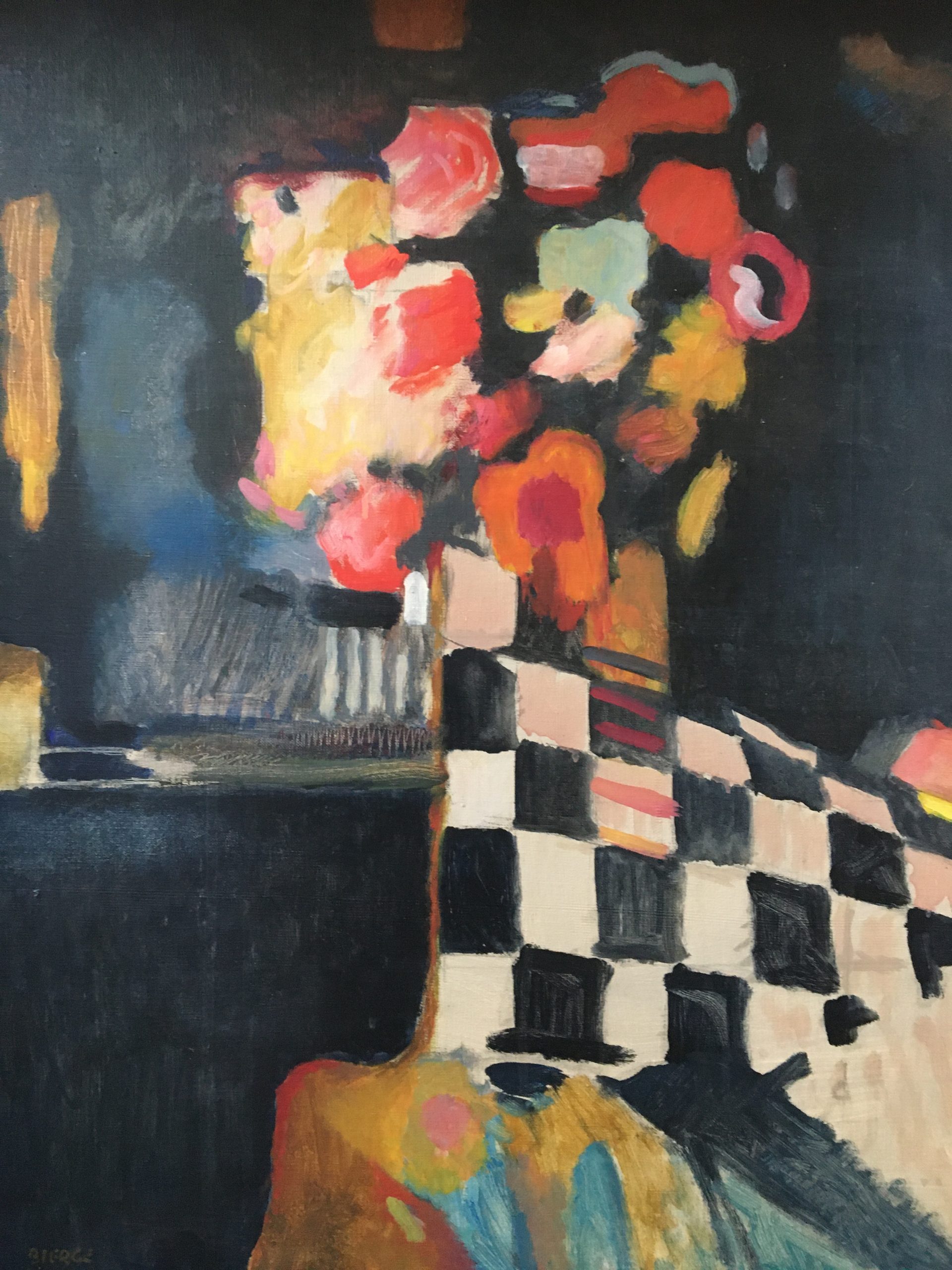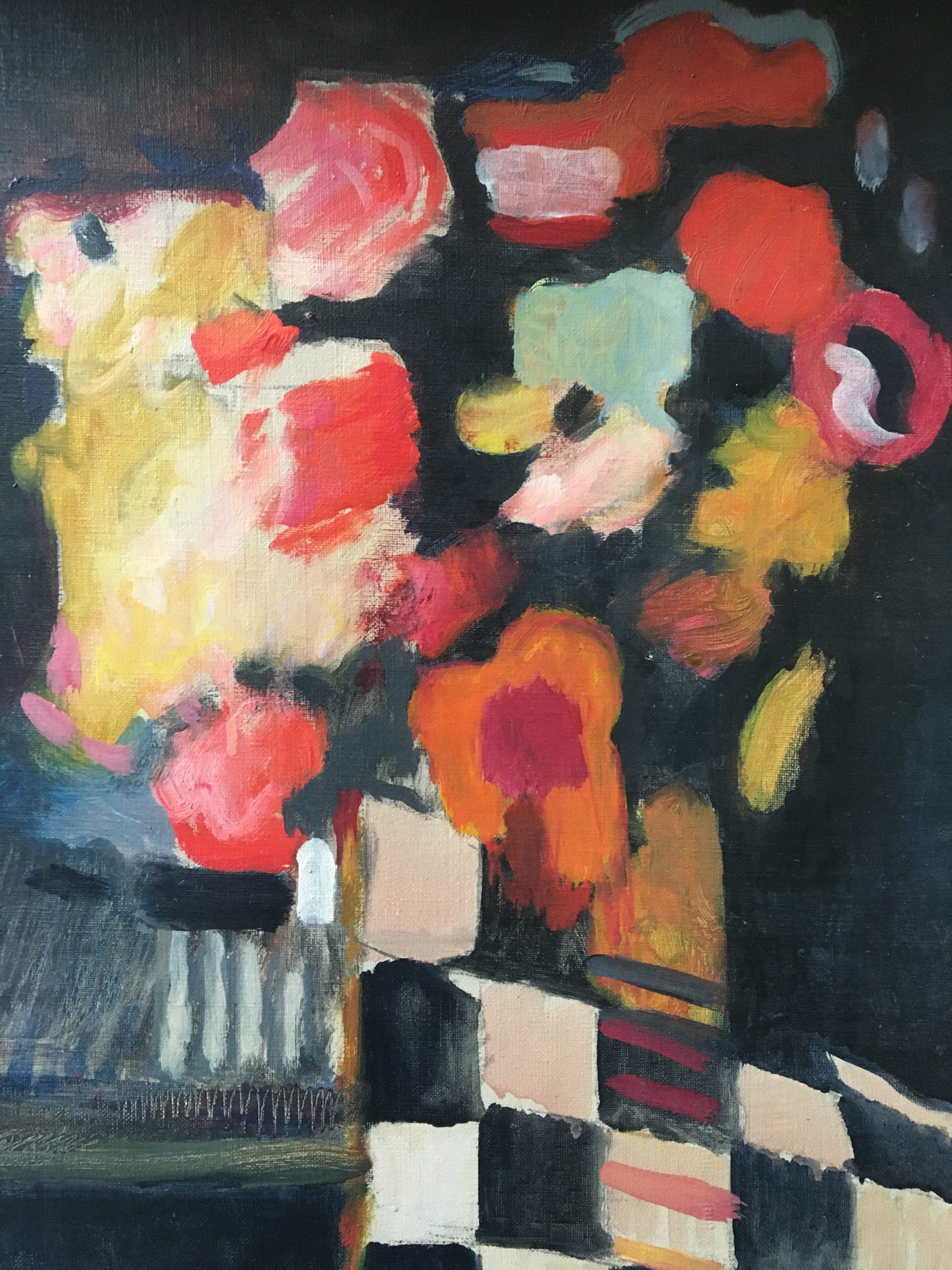 Huile sur toile de Roland Bierge représentant un bouquet de fleur sur un damier. Travail typique de la période des années 1970 avec une très belle utilisation des couleurs.